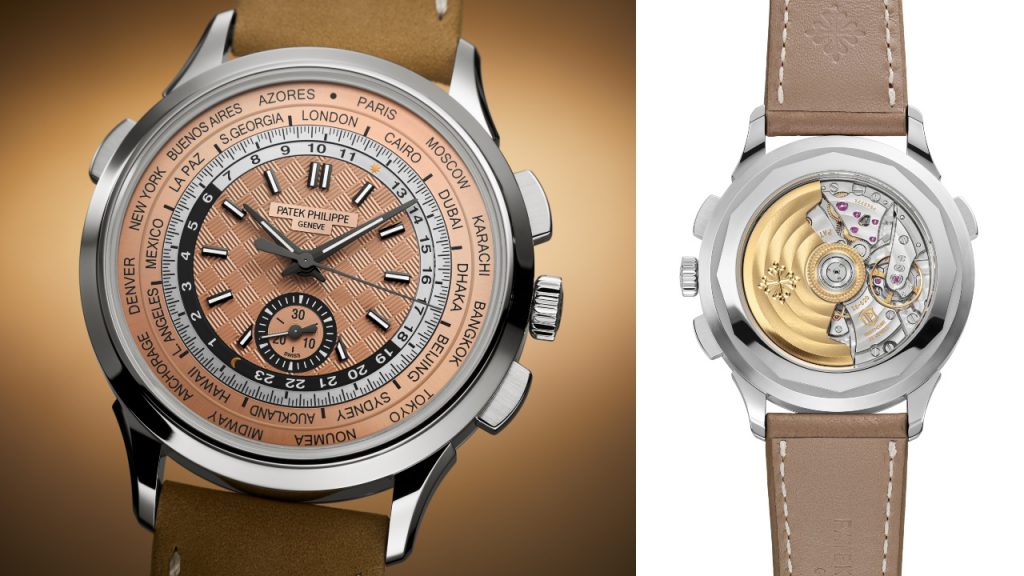 The Ref. 5935A-001 World Time flyback chronograph, priced at US$63,871, is newly available in steel with a vintage-looking salmon dial, a big change from the current reference in white gold with a green dial.