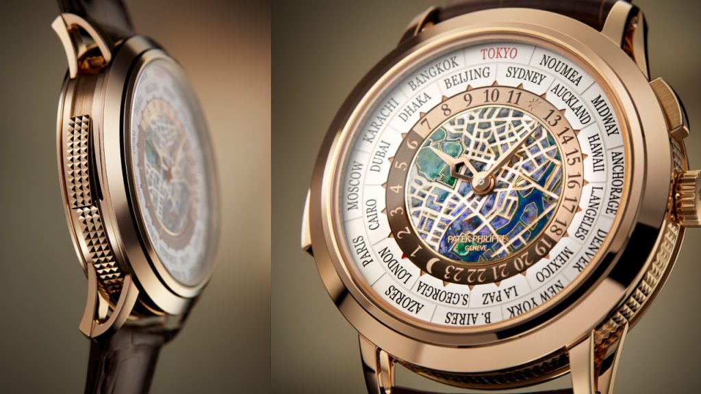 Patek Philippe’s World Timers are always wildly coveted, but this particular 40.2 by 11.49 mm 18-karat rose-gold version for the Tokyo market is an exceptional iteration with a rare handcrafts dial in grand feu cloisonée featuring a map of the centre of Tokyo of the historic Chou district. It also comes equipped with a minute repeater in the self-winding R 27 HU caliber, featuring a patented striking mechanism striking local time for the time zone indicated at 12 o’clock. Its gongs are attached directly to the caseband, which, on the exterior is decorated with a beautiful hand-guilloched hobnail pattern. Like the above reference, it also comes with interchangeable casebooks featuring the “Patek Philippe Tokyo” inscription.