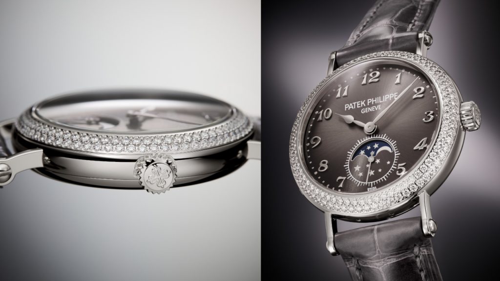 Here’s one for the ladies who appreciate serious complications to come with their very serious Patek purchase. This classic Calatrava officer’s-style 33 by 8.35 mm white-gold timepiece with a moon phase and small seconds indications at 6 o’clock is powered by a manually-wound Caliber 215 PS LU movement. Its moon phase is so accurate it only deviates from the true lunar cycle by one day in 122 years.