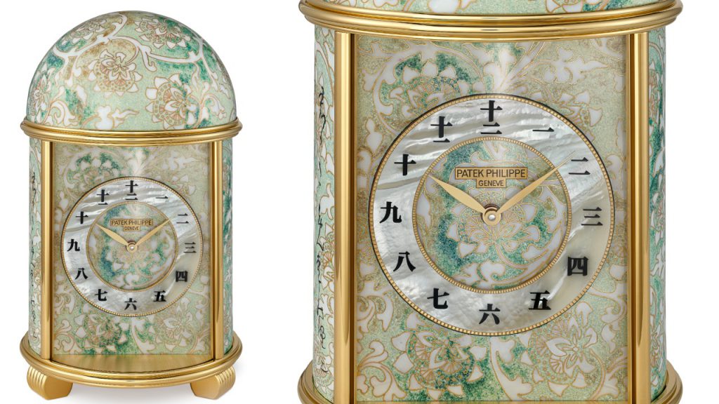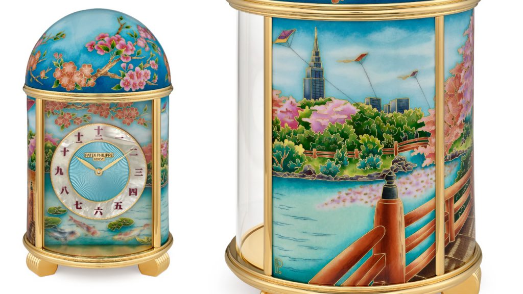 Elsewhere in the rare handcrafts collection is a Grand Feu cloisonné enamel table clock entitled “Tokyo as the Crow Flies” (25014M-001) whose dial presents a stylized map of the city centre atop a guilloche “barleycorn” motif visible beneath the translucent enamel. Fans of Osaka, Hakata and Nagoya will be pleased to know that Patek has also manufactured pieces with dials bearing maps of those cities.