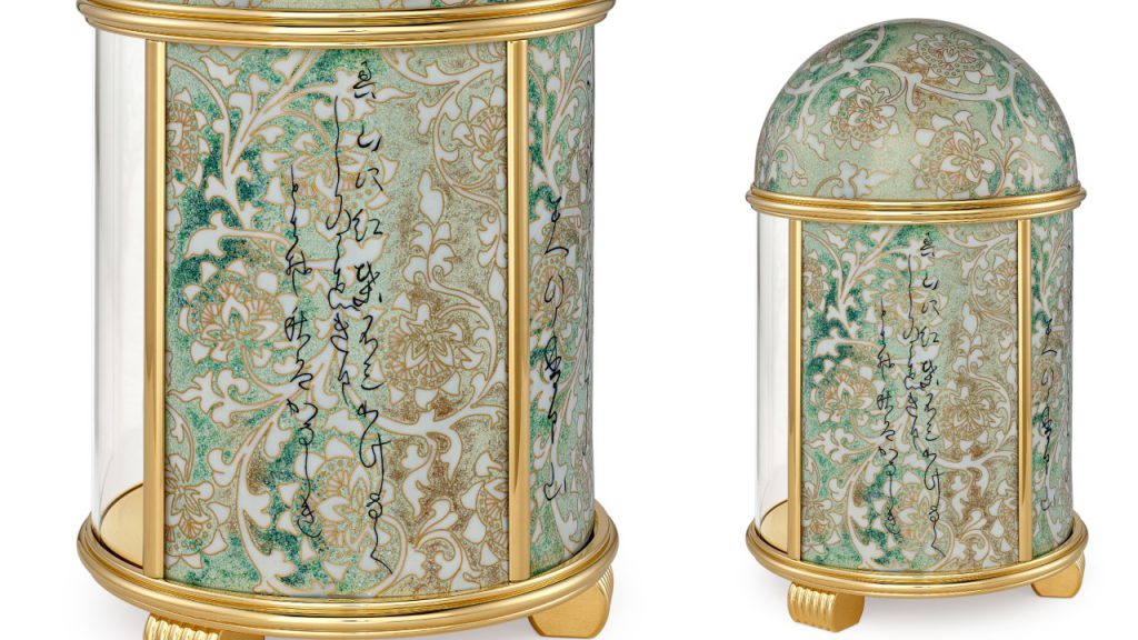 Take the dome clocks, whose rounded side panels and cupolas depict scenes from Japanese culture rendered in Grand Feu cloisonné enamel enhanced with paillonné enamel, which features gold or silver leaf embedded beneath the translucent enamel. One such clock, 20140M-001 “Calligraphy,” honours the refined handwriting art with a floral decoration incorporating fine gold wire, cut into tiny segments and shaped by hand.