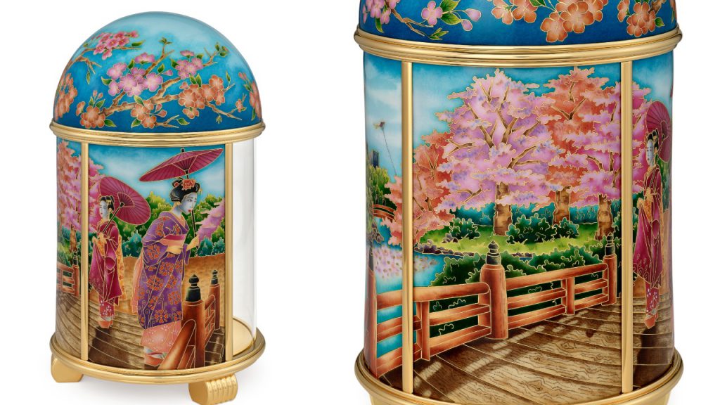 A seascape inspired by a Japanese print, Tokyo by night, and the blue Asian peacock are the subjects of three additional dome clocks, while two small dome table clocks pay homage to the custom of making origami cranes as well as the traditional Japanese parasol.