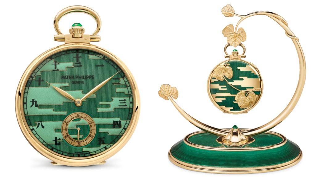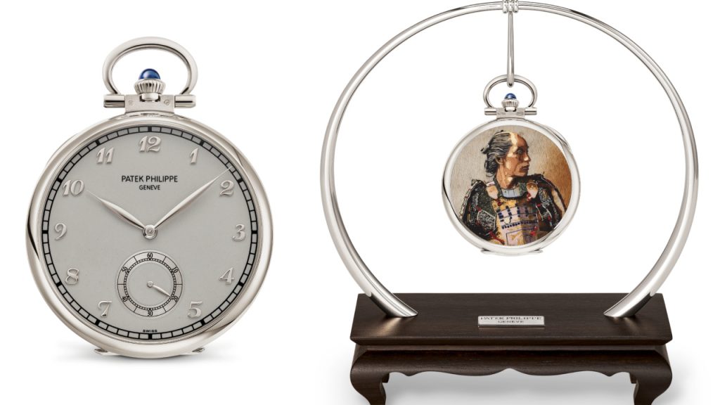 Patek’s pocket watch game has never been stronger than at the Tokyo exhibition, which features several breathtaking works of horological art, including 995/131G-001 “Portrait of a Samurai,” a superlative example of wood-marquetry featuring 800 tiny veneer parts and 200 inlays that incorporate 53 species of wood of different colours, textures, and veining.