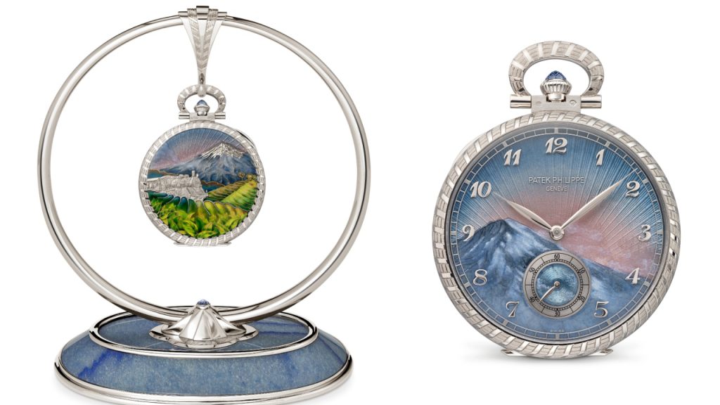 The beauty of nature is a recurring theme, as evident on the back of the pocket watch 995/134G-001 “Shizuoka and Mount Fuji,” which uses a mix of techniques to depict signature details of the Japanese landscape, from cloisonné enamel for the tea plantations to hand engraving in relief for the mountain and the train.