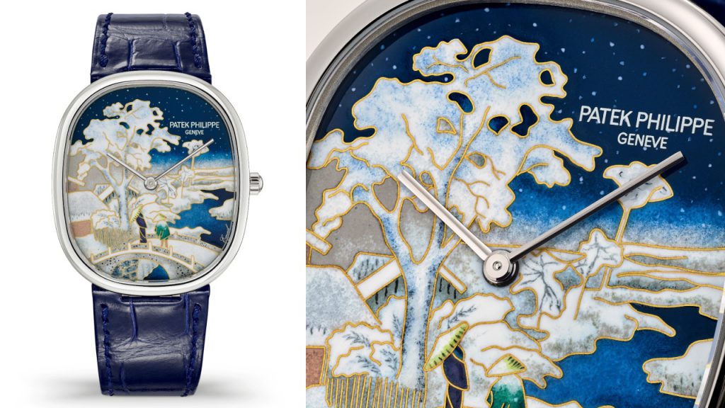 Among the 18 wristwatches created for the exhibition, Patek’s deep respect for Japan is a throughline. Between the crowd favourite Golden Ellipse Ref. 5738/50G-025 “Snow-Covered Landscape”; Calatrava references 5089G-124 and 5089G-125 “Tsuba – Oranges and Flowers,” featuring the hand guards of traditional Japanese swords; and other watches depicting a kabuki actor in wood marquetry, Japanese cranes in grisaille enamel au blanc de Limoges, patterns inspired by kimonos in cloisonné enamel, and a fisherman in his boat in wood marquetry, seemingly no part of Japanese culture has been left unsung.