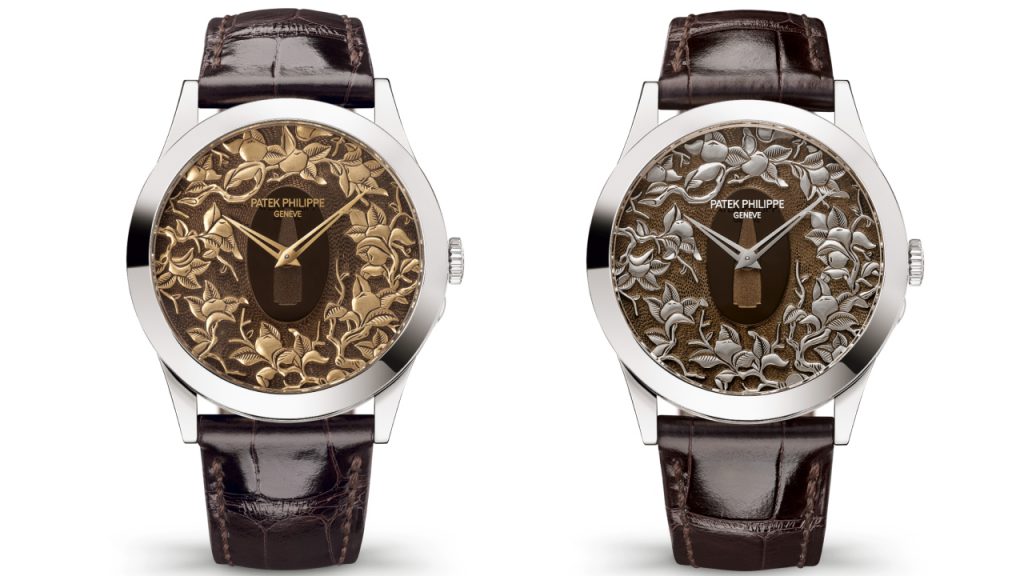Ref. 5538G-016 “Tiger” is a Calatrava with minute repeater and tourbillon, with a cloisonné enamel dial that evokes a Japanese print, and Ref. 7000/50G-011 “Bird on a Red Maple” is a ladies’ self-winding minute repeater with a dial in cloisonné enamel and miniature painting. Both are utterly exquisite.