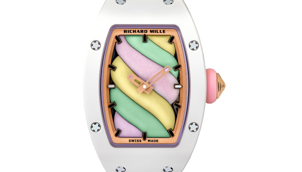 When viewed together, these food-themed timepieces are a riot of colour (a palette consisting of 60 in total) that is so rarely seen in watchmaking that it almost looks out of place. This is no gimmick, however—the commitment to the theme and craftsmanship is absolute. On the RM 07-03 Automatic Marshmallow, for instance, the hand-enamelled titanium and rose gold dial conveys mouth-watering textures, while the crown is a delectable swirl of decorative icing.