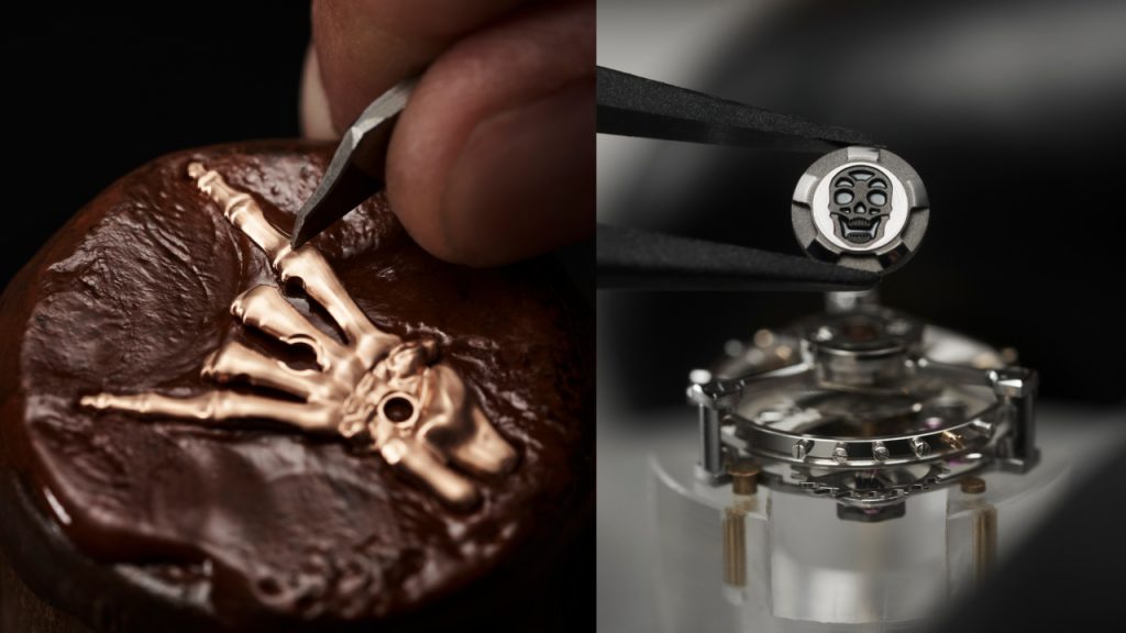 The horns aren’t the only nod to rock ‘n’ roll: The index markers on the dial resemble guitar plectrums, the titanium baseplate features palm-like gold details and the “goth” crown is topped with a skull. The watch will withstand the liveliest of concerts, too. The baseplate and bridges reportedly underwent intensive testing to ensure resistance to drops and scrapes.