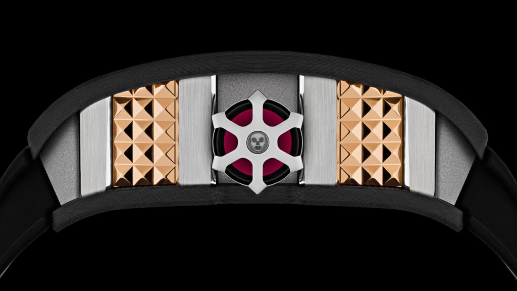 A team led by Genevan engraver Olivier Vaucher painstakingly finished each devil’s horn by hand. The infamous icon is housed within a curved, tonneau-shaped case made of grade 5 titanium. The not-so-heavy metal is coloured black, naturally. The bezel and caseback, meanwhile, were crafted from an exclusive combination of carbon and gold leaf known as Gold Carbon TPT.