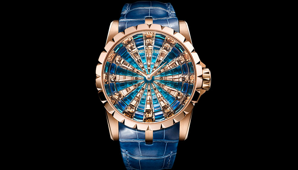 It takes something really special to stand out among the audacious Excalibur collection of Roger Dubuis. And here it is: the Knights of the Round Table III (RM1,153,600), a 45mm radial whirlwind of 18-carat pink gold and blue enamel. The ‘time’ part of this timepiece seems almost incidental, but this two-hander is powered by the self-winding Calibre RD 821, which bears the Hallmark of Geneva.
