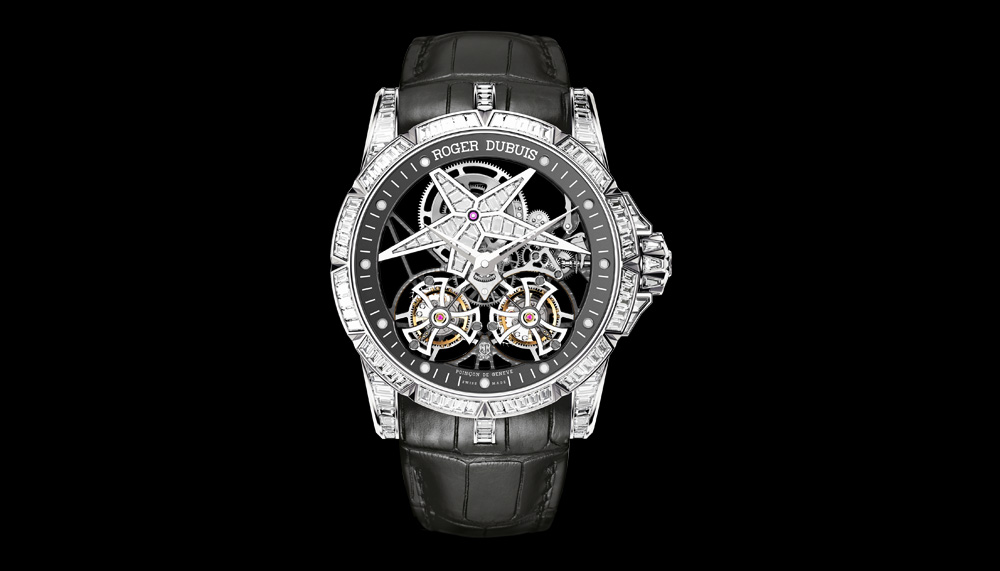 Roger Dubuis gives an old favourite a dazzling makeover with the Excalibur Star of Infinity, a diamond-set version of its iconic Excalibur Skeleton Double Flying Tourbillon. The RD01SQ calibre has been plated in charcoal grey rhodium in order to create a darker background on which the diamond-set star may better stand out and appear to float. Because of the skeletonised movement, the points of the star seem to stretch out into empty space, hence the ‘infinity’ in the timepiece’s name.
