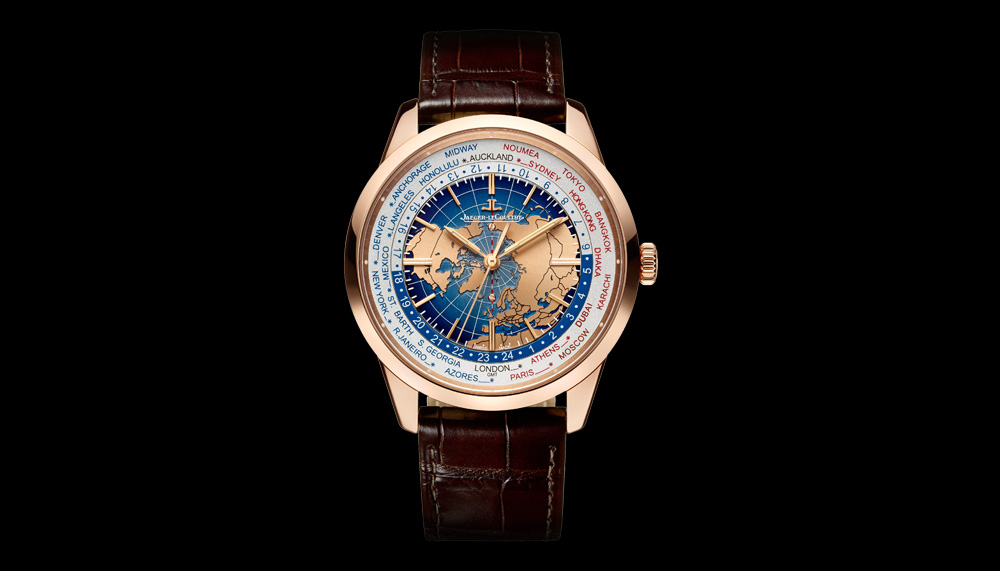 Taking centre stage on the dial is a miniature depiction of the world map. Engraved in gold, the continents have a mesmerising sunburst finish while in the background, the oceans are lacquered in subtly graded shades of blue. In the back is a gold oscillating weight in the shape of Jaeger-LeCoultre’s logo, crafted from a single block of solid gold.