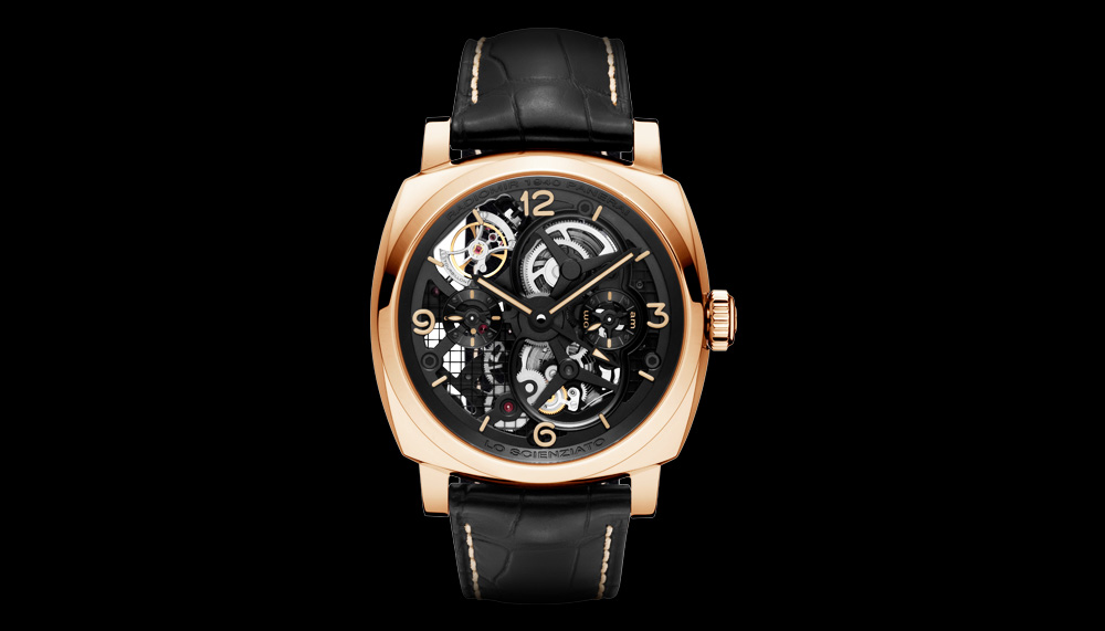 Galileo Galilei’s law of isochronism (or equal intervals) of the oscillations of the pendulum contributed greatly to watchmaking. It unlocked the puzzle to regulating the swing of the balance wheel as the power reserve depletes between each winding. In 2012, Panerai sponsored a special section in the Museo Galileo in Florence detailing his contributions to time measurement. In conjunction, the brand launched the Lo Scienziato (The Scientist) range. The latest addition, Radiomir 1940 Tourbillon GMT Oro Rosso, showcases the skeletonised P. 2005/S hand-wound caliber with an almost dial-less design. The tourbillon completes a rotation within its cage every 30 seconds instead of the more usual 60, and in a perpendicular direction, instead of parallel, to the balance wheel.