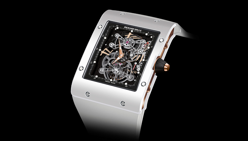 At just 8.7mm thick, this timepiece is slim by Richard Mille’s standards. Its dimensions are even more impressive when one considers that besides the usual time indications, it holds a tourbillon, power reserve and function indicator. Powering the watch is the 4.65-mm thick manually-wound RM 017 calibre, which has a baseplate, bridges and balance cock machined from grade 5 titanium, an extremely rigid material that provides the movement with great strength. The case encapsulating the movement is equally strong, being constructed from white or black ceramic created at a high pressure of 2,000 bar. This process increases rigidity by 20 to 30 per cent and reduces the material’s porosity to a minimum. The result is a scratch-resistant material second only to a diamond in hardness. Because the timepiece was created for the Asian market, the 12, three and nine o’clock hour markers are in Chinese characters.
