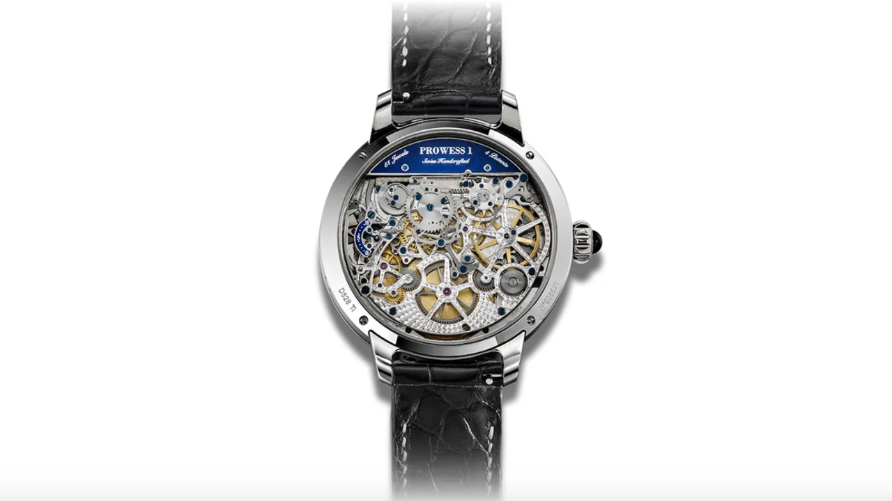Except, of course, aesthetically, by which measure the Prowess 1 could be considered a work of art. The inner aventurine dial, calendar displays, and flying tourbillon are surrounded by visible movement components, which constitute just a handful of the 744 parts that make up the in-house caliber R28-70-00X with its 10 days of power reserve. Flip the watch over, and a captivating display of haute horlogerie is revealed: Côtes de Genève, perlage, and other artisanal techniques provide a visual feast. As one would expect, the timepiece is exceedingly time-consuming to produce; as such, the Prowess 1 will be limited to just eight pieces per year offered in 18-karat red gold, 950 platinum, and grade 5 titanium.