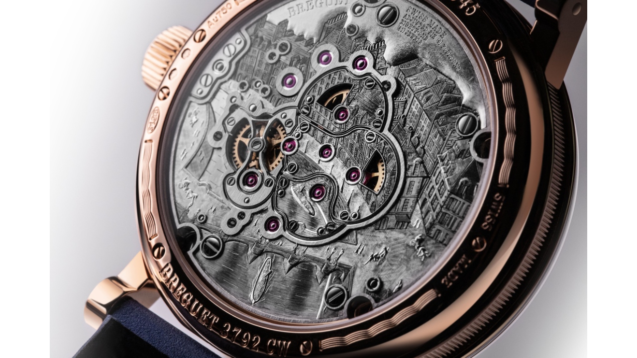 Powered by Breguet’s 588N2 movement, this horological masterpiece blends expert skills with technical sophistication, including several artistic crafts cultivated within the manufacture. A brand new guilloché pattern was created for this timepiece from a dedicated atelier by artisans: the radiant flinqué, a motif visually reminiscent of regular sound waves. Additionally, more than 100 hours were poured into merely creating the engraving on the caseback, an intricate aerial view of the founder’s workshop at 39 Quai de l’Horloge.