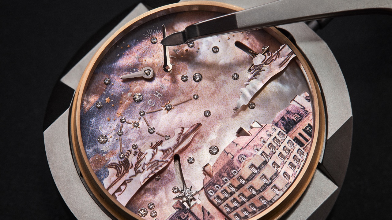 The 39mm white gold case is snow-set with 191 diamonds, while the pink gold bezel features 142 diamonds of its own. The caseback is decorated with a pink gold star, and is engraved with the saying: Il était une fois… or, in English, ‘Once upon a time…’. A previous version of this watch featured a similar scene, but with a blue-hued night setting, and won the Ladies’ Complication prize at the 2023 Grand Prix d’Horlogerie de Genevé (GPHG) awards.
