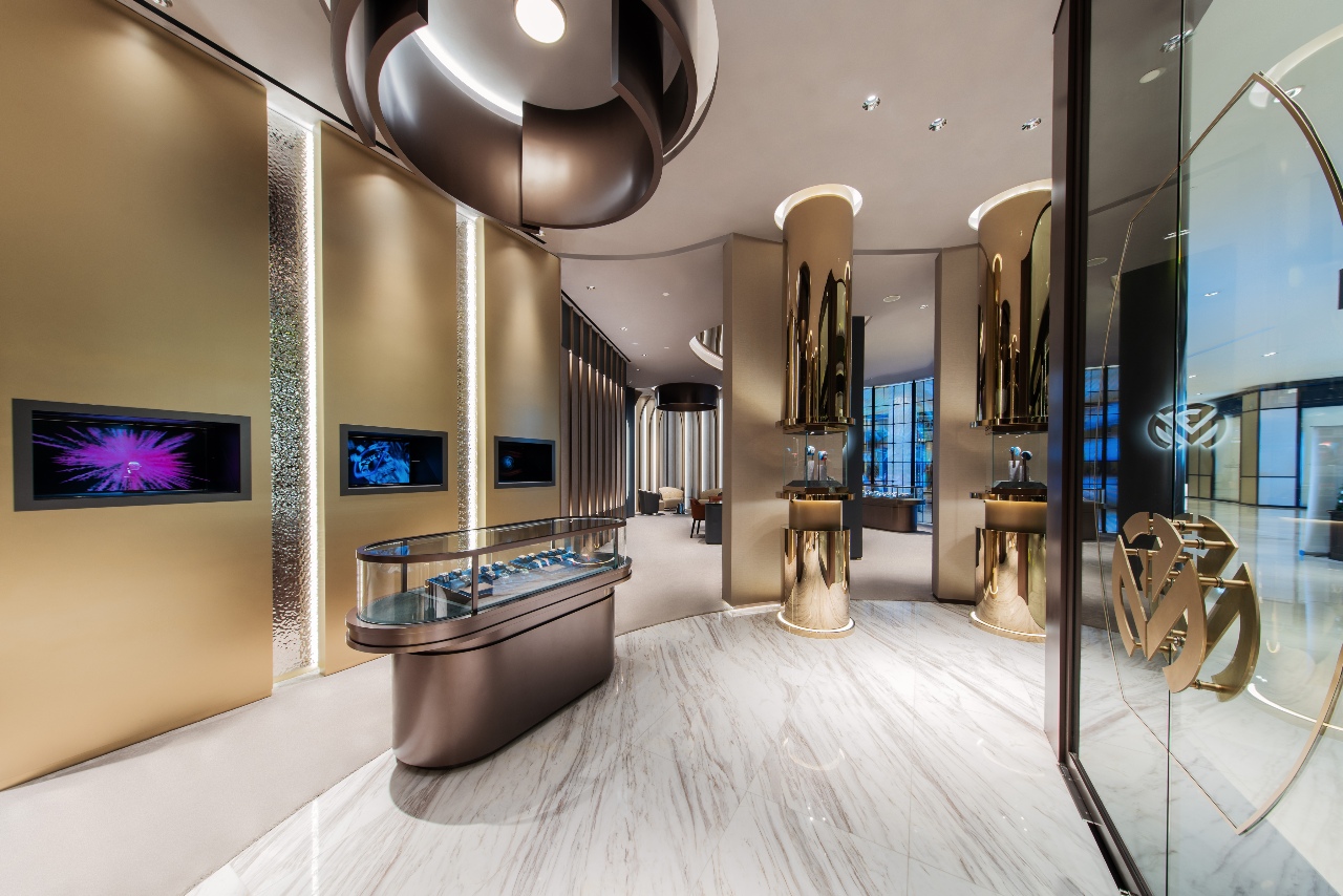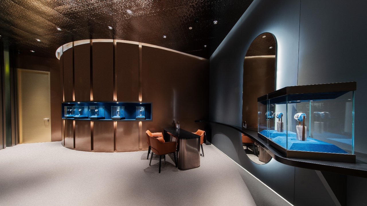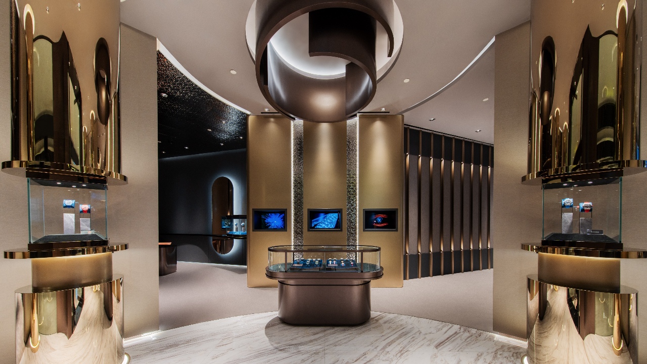 The independent Swiss watchmaker Franck Muller has been a popular brand in the Malaysian horological community for some time now, with its first standalone boutique opening here in 2021. That presence has been solidified with a grand new storefront, occupying a prime location on Level 2 of Pavilion Kuala Lumpur—an expansive one at that, at 1,887sqft. The styling is modern and luxe, with warm tones and reflective surfaces suggesting the precious metals and stones that the brand is known for. Next to its wide array of current offerings, a display wall features some of Franck Muller’s greatest hits—the likes of Crazy Hours, Giga Tourbillon, and Thunderbolt Tourbillon, all of which are testaments to why the brand is called ‘master of complications’. A sequestered private bar is reserved for collectors and other VIPs. Outside, a floor-to-ceiling curved display showcases the brand’s bold and typically highly technical offerings—an attention-grabbing display at one of the mall’s major thoroughfares.