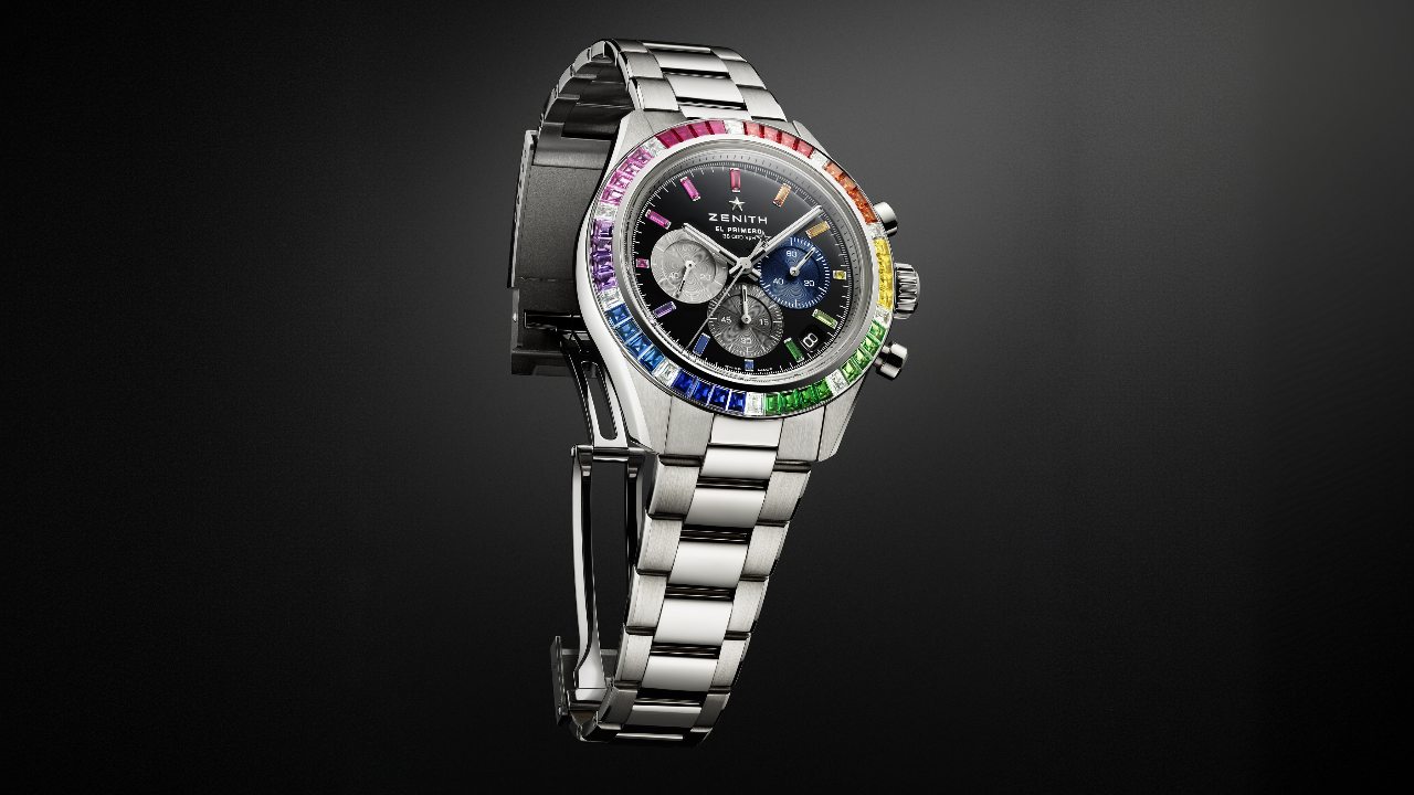 This beauty’s bezel is also fitted with 50 baguette-cut gemstones—while a rainbow array of 40 coloured sapphires surround the dial, 10 white diamonds punctuate the bezel in accordance with 1/10th-second intervals, cleverly echoing the El Primero cal. 3600’s hi-beat capabilities. Roughly five carats of stones are joined by colour-matched sapphire hour markers that stand out against a deep-black dial. Completed with a triple-register chronograph display in greys and blue as well as a lume-filled handset, the new Chronomaster Sport Rainbow in white gold joins an ever-growing array of riotously colourful rainbow-themed watches.