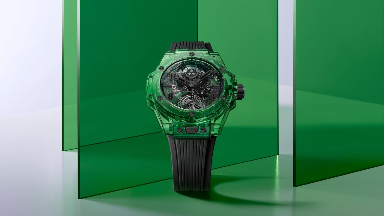 Hublot’s neon green machine is back, and it’s packing a tourbillon movement (RM972,300). The transparent green SAXEM-cased watch was introduced last year with an automatic movement. Hublot launched the proprietary material in yellow in 2023. SAXEM stands for Sapphire Aluminium oXide and rare Earth Mineral—a sapphire crystal-like substance that Hublot infuses with a combination of minerals to create a fluorescent colour that glows like neon.