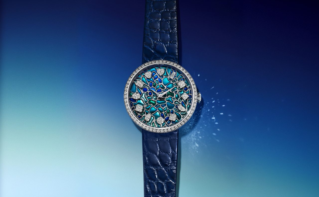 The latest version is something special: taking after Tiffany & Co.’s stained glass lamps, in particular its Wisteria lamp, the dial of this timepiece replicates the motif of the household design item in droplets of enamel in shades of green and blue. It features a 38mm white gold case (price on request).