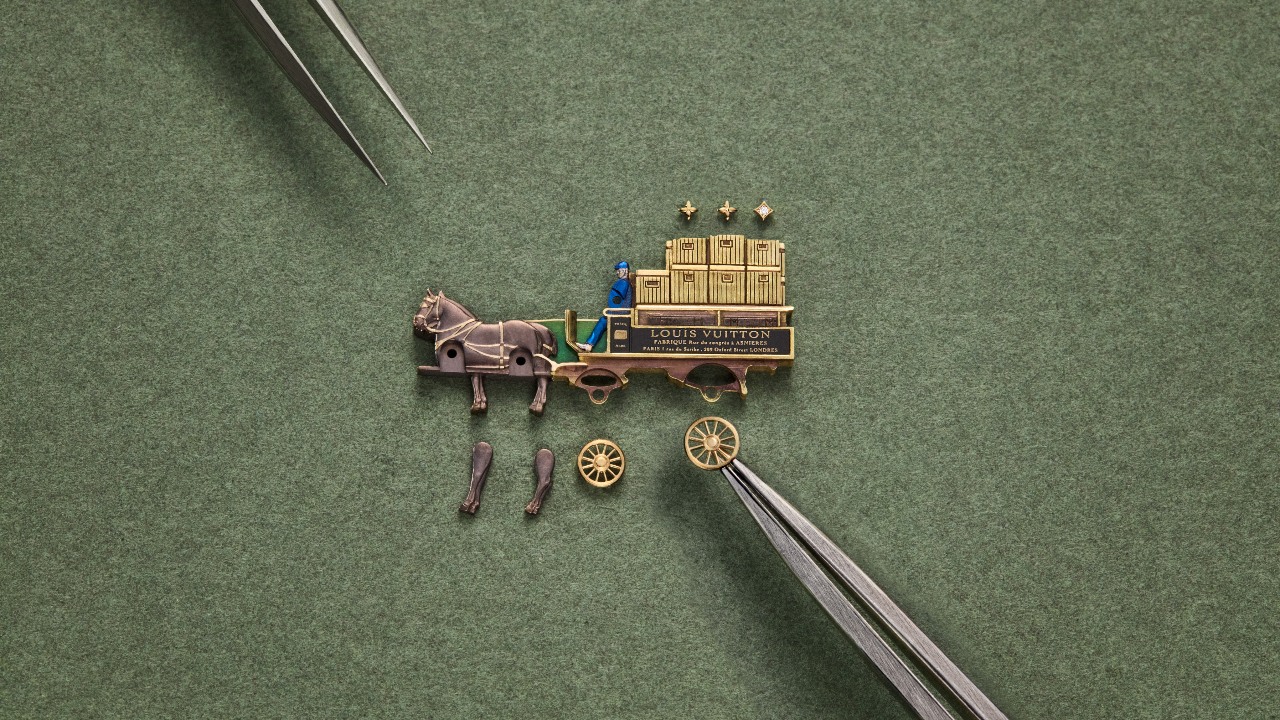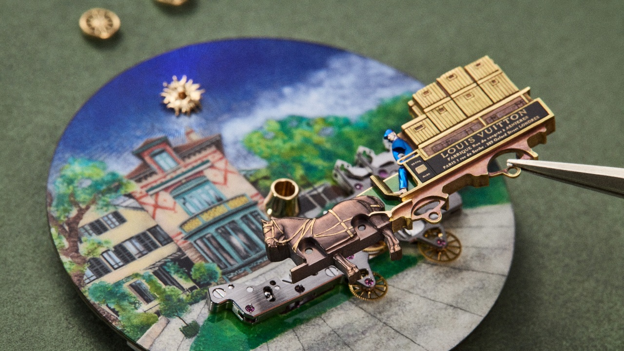 The dial side depicts a scene set in Asnières: in the background is the manor house, while in the foreground is a horse and carriage right out of the 19th century. The trigger at six o’clock will bring it to life—the horse trots away, the carriage wheels turn, the coachman springs to life, and the Louis Vuitton trunks loaded in the carriage pop open to each reveal its own miniature Monogram flower. At 12 o’clock, the shining sun rotates and holds an LV Monogram Star-cut diamond, the smallest such stone the Maison has ever created.
