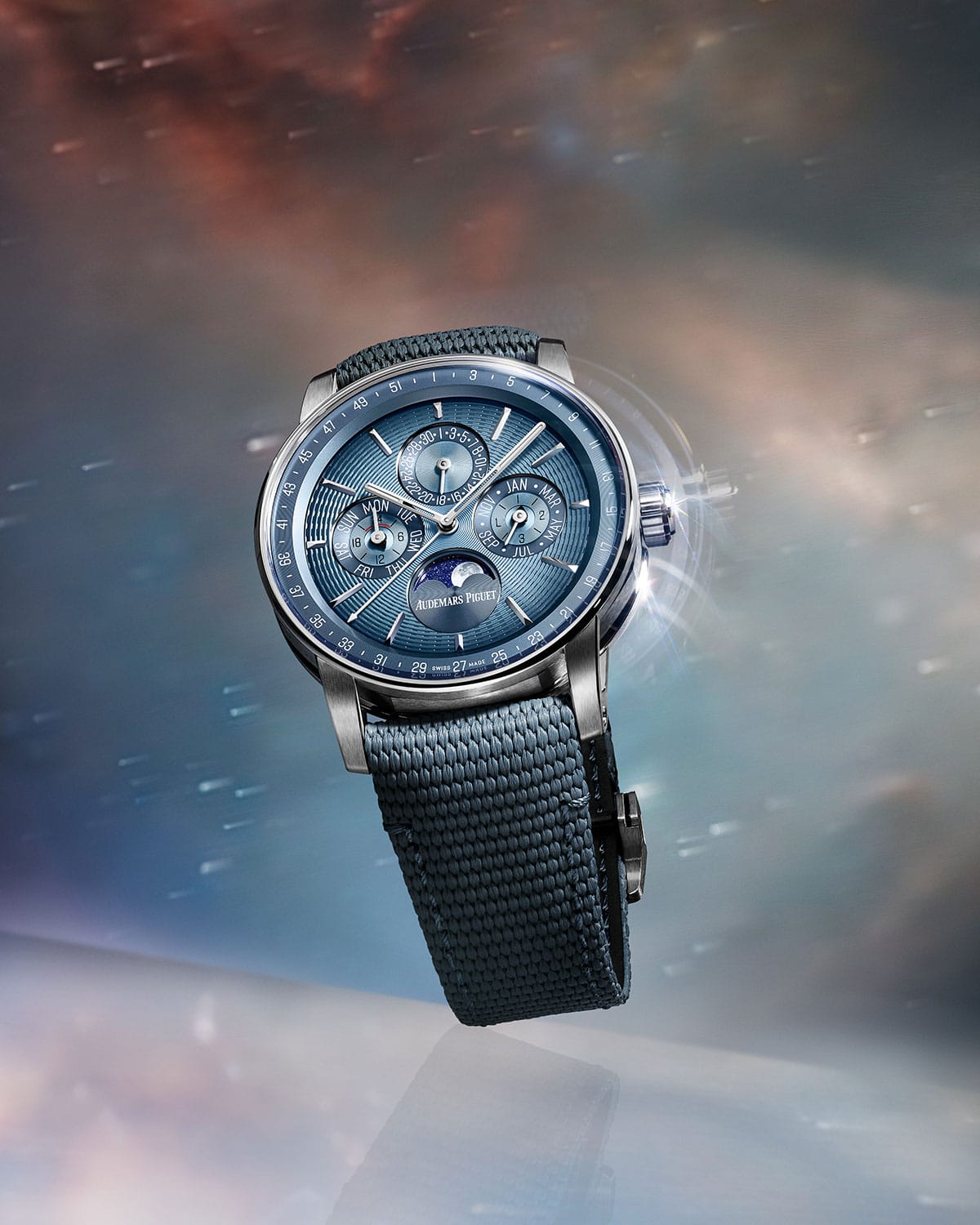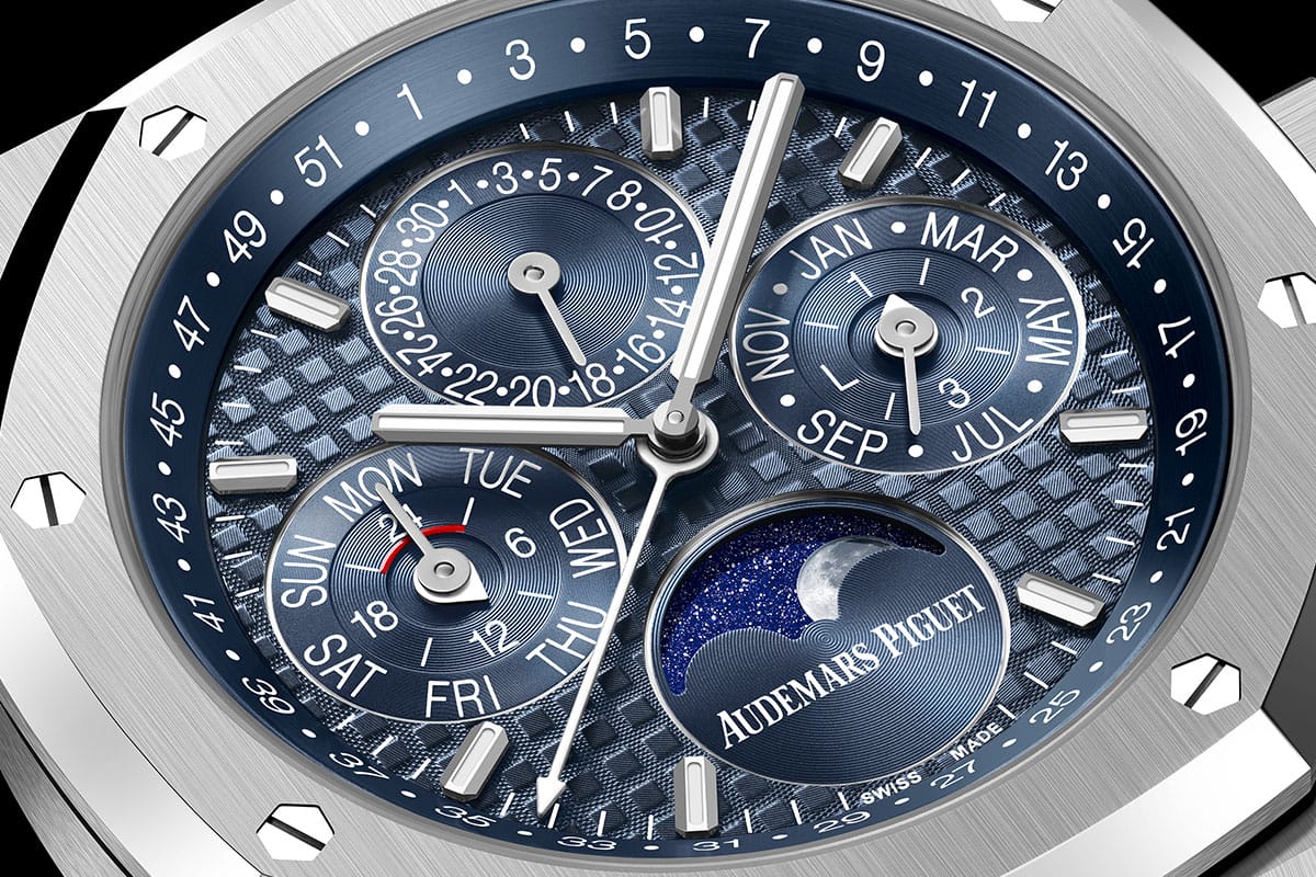 From a technical standpoint, the big news from Audemars Piguet this year is its new perpetual calendar movement, Calibre 7138. Engineered with ergonomics and user-friendliness in mind, all of its functions are controlled solely through the crown. It debuts in a trio of 41mm executions: two Royal Oaks, and one for the Code 11:59. The difference is stark: the Royal Oaks are as weighty and retro-luxe as ever, with their Grande Tapisserie dials and integrated bracelets in steel or sand gold. Meanwhile, the Code 11:59 is the equivalent of a linen shirt, shorts, and flip-flops—expensive, well-tailored, and bespoke ones, mind, but nonetheless more relaxed. It has a light blue gradient dial, which has an embossed concentric ripple pattern that has become a collection signature, paired with a white gold case. The thing that really sets it off is the strap: calfskin on the wrist side for luxury, and rubber-coated with a woven textile pattern on the exterior—dressed-down stylishness at its finest. These are slim watches, too: the Royal Oaks are a mere 9.5mm in depth, while the Code 11:59 is a more laid-back 10.6mm. As a bonus, each of these is available as a 150th anniversary limited edition; they’re nearly identical save for the manufacture’s signature at 6 o’clock on the moonphase subdial, which is, instead, styled as a flowing script inspired by historical documents.