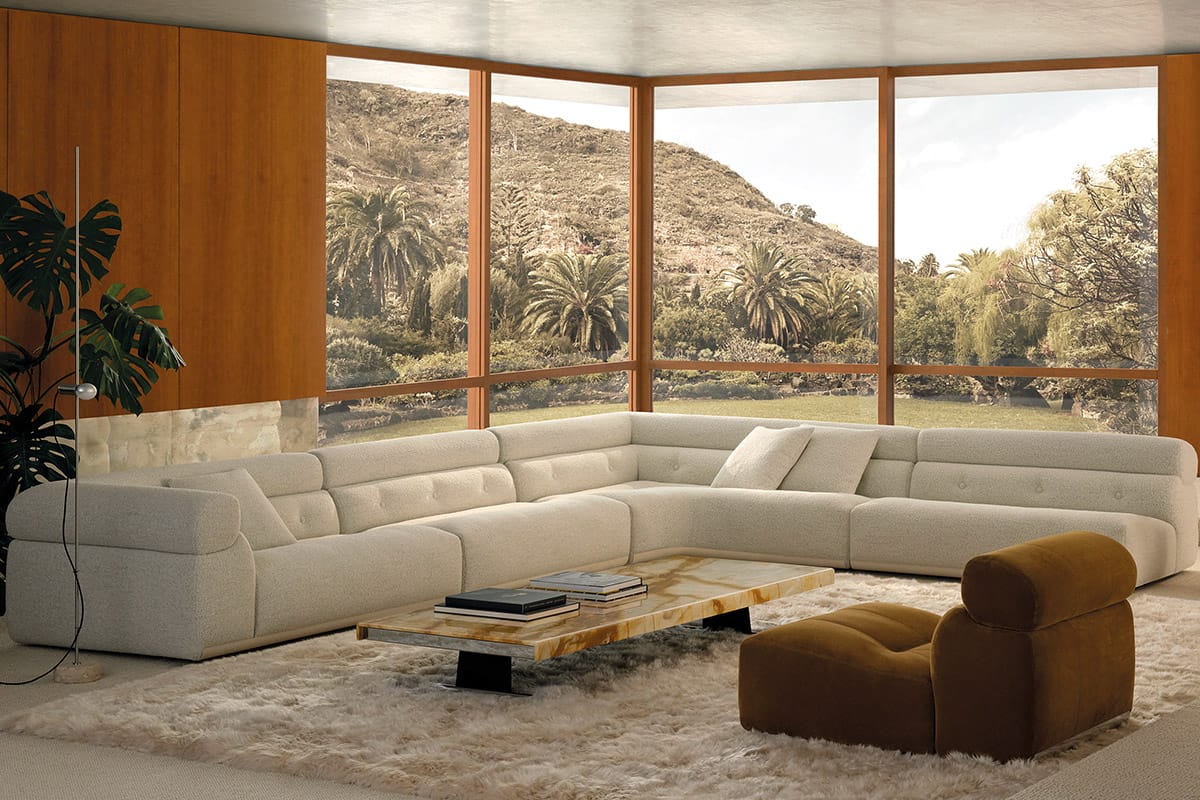 Coupé, which is designed by Italian architect Giampiero Tagliaferri, reflects the designer’s affinity for vintage pieces, often blending the old with the new to produce something entirely fresh. For Coupé, Tagliaferri draws inspiration from the Italian post-war period, with its organic silhouette and ergonomic sinuosity. As an architect, his fascination with the way a Brazilian seed perfectly interlocks with its fruit resulted in the overlapping rounded volumes that give this sofa its unique character. A closer inspection will also reveal precious couture-inspired details, displayed in the tone-on-tone longitudinal stitching and careful incorporation of buttons on its backrest. The Coupé sofa is upholstered in suede or leather, though the designer finds that the suede, in particular, lends a sensual dimension to the design.