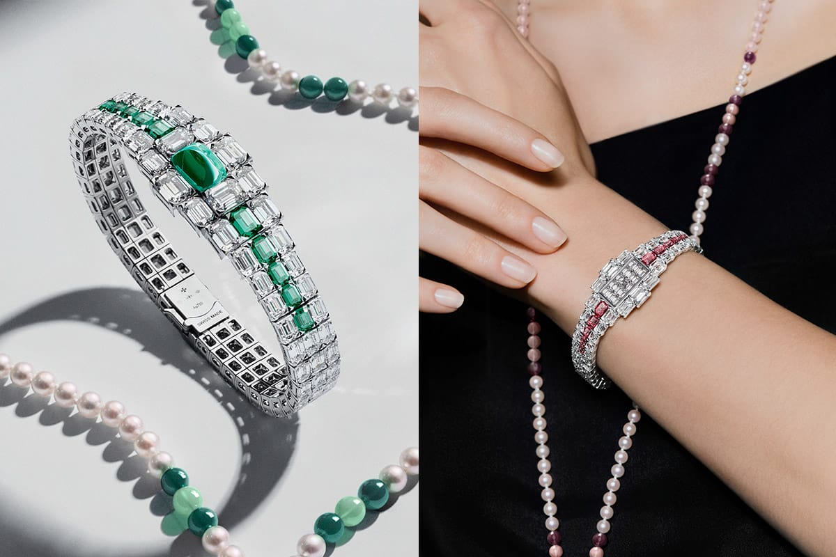 The watchmaker expands its legacy of jewellery timepieces with three new interpretations of the Grand Lady Kalla, adding coloured gemstones to the High Jewellery model introduced in 2024. Celebrating a heritage stretching back to early gem-set watches of the 19th century, the collection continues a lineage that began with the celebrated Kallista of 1979. Each variant pairs white diamonds with either emeralds set in platinum, or sapphires and rubies set in white gold, complemented by Akoya pearls and polished ornamental stone beads. Each model comprises four fully gem-set components: a watch, a jewel piece, a three-row rivière-style bracelet, and an 85cm sautoir necklace, allowing the wearer to configure the set in four different ways using hidden, tool-free mechanisms. Emerald-cut stones emphasise clarity and architectural brilliance, while a central sugarloaf-cut gemstone on the jewel piece offers depth and rarity. Presented with original designer gouache and certification, Grand Lady Kalla exemplifies Vacheron Constantin’s 270-year pursuit of technical and artistic excellence.
