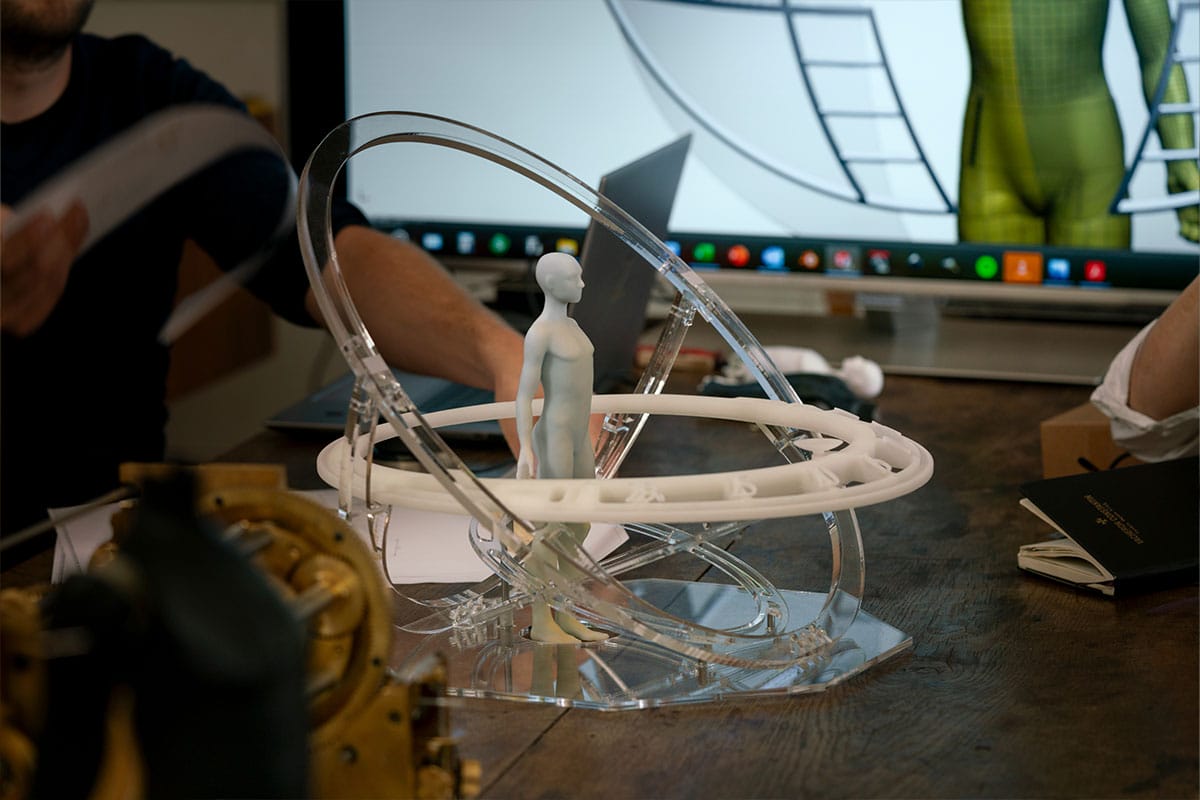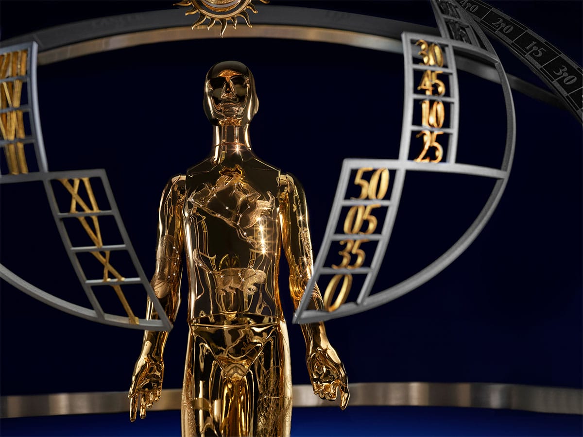 The automaton’s movement is ambitious in scale and grandeur. Able to act on demand as well as to be set up to 24 hours in advance, the first of three sequences begins with a melodic announcement. The automaton will stir to life, looking around as if awakening, before gesturing to the celestial symbols in front of it as part of its first two sequences. The third sequence is linked to the timekeeping and, hence, varies throughout the day—the automaton will point out the hour and minutes on the scales suspended before it. In a whimsical touch, the numbers on those scales are not in order, which means that the posture of the automaton will change more dramatically during subsequent activations.