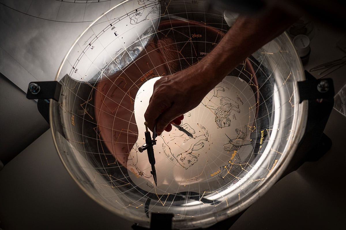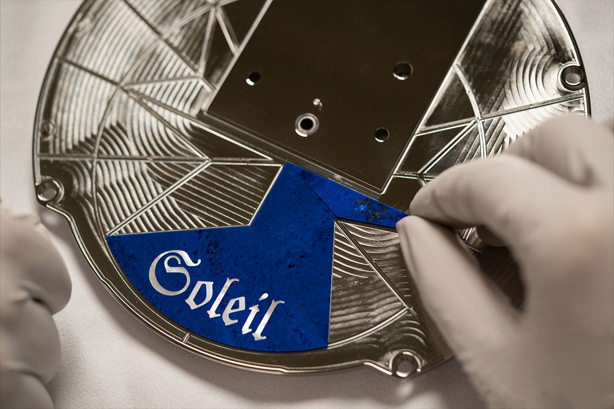 As impressive as the clock section is, the most eye-catching aspect of La Quête du Temps is what lies above it as the uppermost partition. Here, standing contemplative beneath a glass dome painted with some of the major constellations—Leo, Taurus, Gemini, Virgo, Libra, Orion, and Ursas Major and Minor—as they would have appeared at Vacheron Constantin’s founding on 17 September 1755, is a statue-like astronomer, standing 28cm high in cast bronze. It is also not a mere statue, but an automaton, consisting of eight articulated sections. In addition, a golden sun is positioned up high, a three-dimensional retrograde Moon is set in front, and hour and minute scales curve to the left and right. The magic happens here, with the automaton, but is enabled by the engine room housed in the structure’s octagonal base. It is clad in transparent rock crystal, allowing viewers to admire it in action when it powers both movement and music.