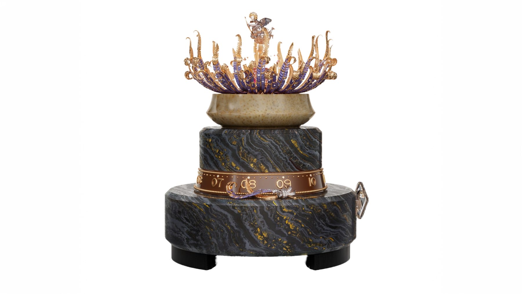This year was no exception, as Van Cleef & Arpels showcased two automata, the first being Naissance de l’Amour. Standing about 30cm high on a stout base of carved iron eye—a mineral with a distinctive streaked appearance—at rest, it is topped by a cocoon of gold feathers decorated with various shades of purple lacquer. When wound, those feathers open and—accompanied by the melody from a carillon—up rises a diamond-covered rendition of the Cupid. It will look this way and that for a moment, while fluttering its translucent plique-à-jour enamel wings, before descending back into its hideaway. The figure itself is mounted on a base of floral composition, including the generous use of pink sapphires. The feathers are held in a petrified palmwood bowl, while a rotating ring at the base tells the time. The mechanism behind Naissance de l’Amour’s animation was designed in collaboration with the legendary François Junod, one of the world’s only automaton specialists. It is a unique piece that is the latest in a series that uses a similar mechanical concept, one that began in 2022 with the nature-inspired Rêveries de Berylline.