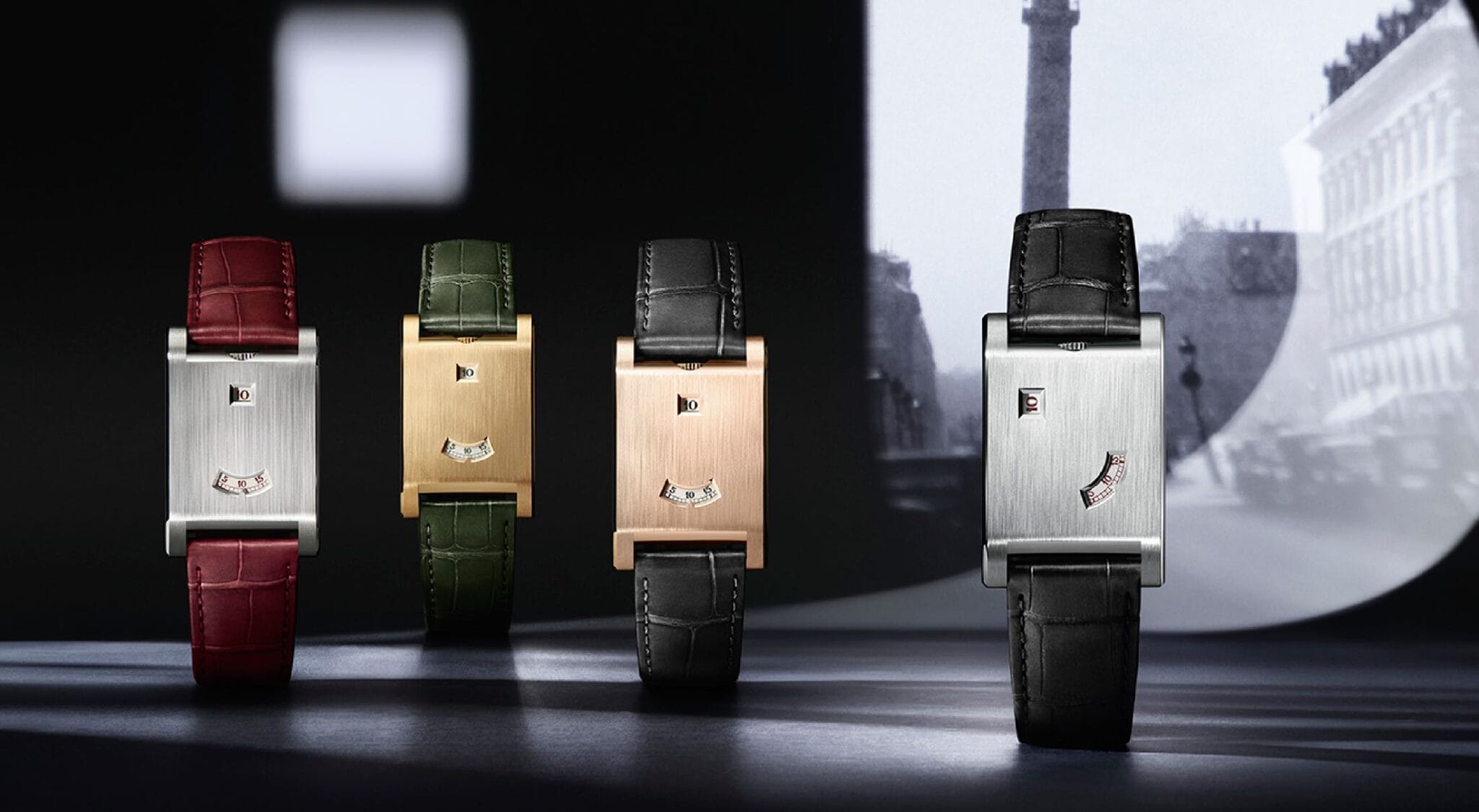 The Tank à Guichets from the Cartier Privé collection offers a fresh interpretation of the iconic design first launched in 1928. Retained design elements include the hour aperture at 12 o’clock and the minute aperture at 6 o’clock, just like the original, with the winding crown also elegantly positioned at 12 o’clock.