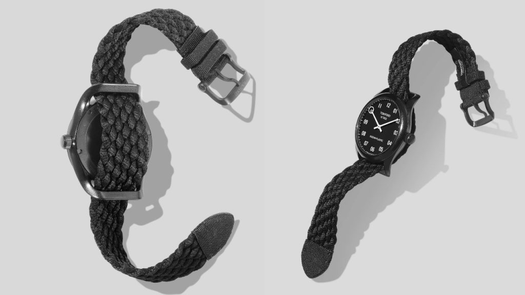 The handsome watch has a classic round 40 mm case with a black DLC stainless steel screw case back, and is water-resistant up to 330ft. Like the case, the strap is made from ocean plastic, braided from fibres spun from the repurposed material.