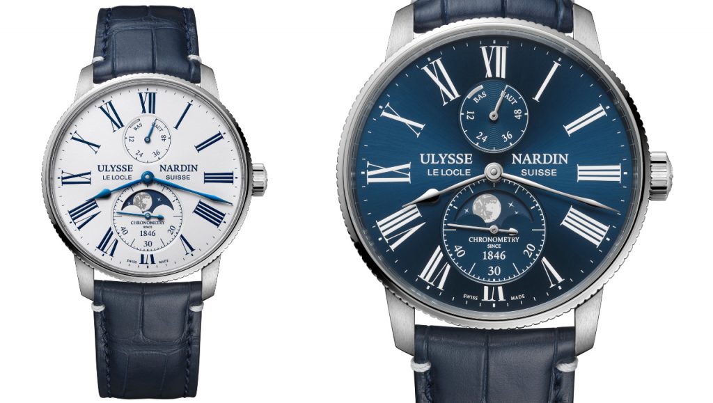 Finally, a moonphase version of the Marine Torpilleur is offered in either a blue sun-brushed PVD or varnished white dial set in a 42 mm by 11.13 mm stainless steel case with a fluted bezel. It is powered by the calibre UN-119, an automatic COSC-certified movement with 60 hours of power reserved indicated at 12 o’clock. Just beneath, at 6 o’clock, is the moonphase set within a subdial that also reads the small seconds. The moon is made with a multi-layer decal, while the starry sky is made of blue PVD. Both versions are limited to 300 each.