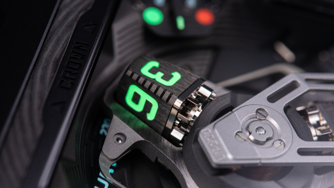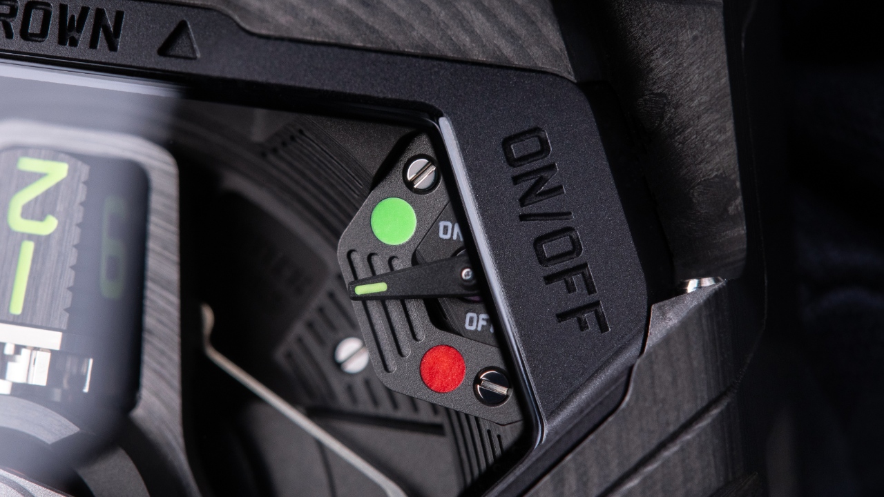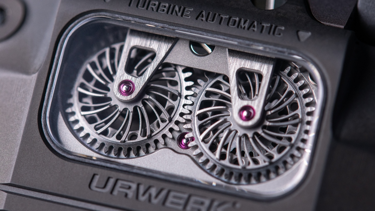 The new UR-7.30 calibre is self-winding, unlike its predecessor. As such, it packs two sets of turbines that are visible through a window on the caseback. They act as a shock absorber, protecting the movement from undue jostling. There are also two switches on the back of the watch. One of these adjusts the ‘air brake’, which modulates the winding efficiency of the system and can be tailored to the wearer’s activity level. The other disengages the rotor entirely, leaving the movement as manual winding only—advisable during particularly vigorous activities. Both of these functions are indicated by windows on the front of the watch, at the top corners.