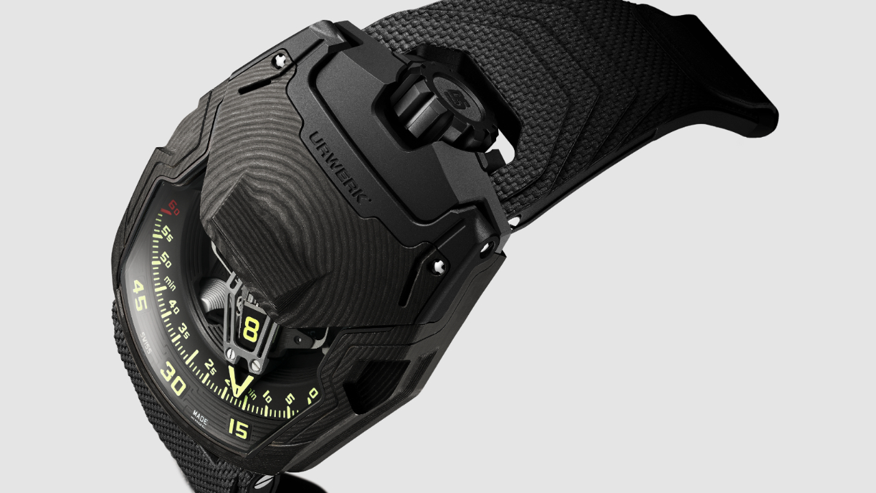 Visually, the UR-230 ‘Eagle’ bears a strong resemblance to its predecessor, with its sweeping profile, curved sapphire crystal, and distinctive bezel shape. Although some parts of the case are made from titanium, its visible externals are largely CTP carbon. This is a material that was part of the UR-220’s debut and is durable, lightweight and has a distinctive concentric pattern. The most obvious difference on the UR-230 is the addition of a cover—a half-hunter case, you could call it—that sheathes the top half of the watch. While down, the cover leaves only the essentials of timekeeping visible, which in the case of URWERK is the pertinent satellite of its trademark wandering hours system. The concept is unchanged from before—the movement consists of a three-armed carousel with a rotating block of four numerals at the end of each, which will turn to show the correct hour as it sweeps along the 120-degree segment at the bottom of the watch. It is accompanied by a 3D-printed aluminium retrograde minutes arm that will move in sync with the hour block.