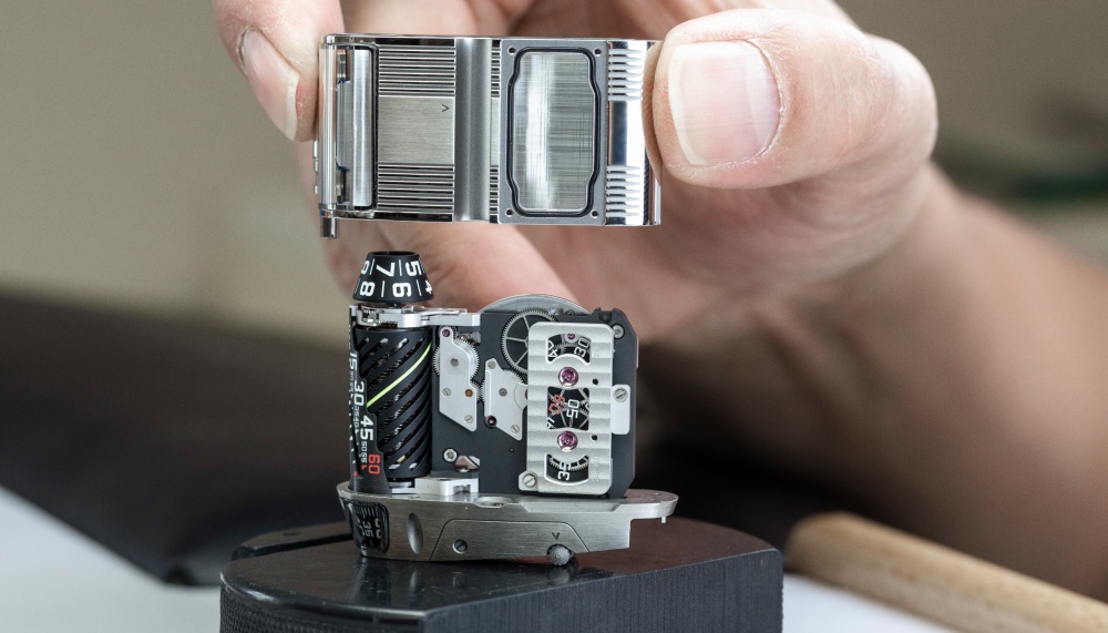 “This was another thing we had to find a solution for, because it was positioned quite far down in the case,” relates Frei. “In order to bring that up to the surface, we had to do something.” The solution lay in another childhood experience with his geology-inclined father. “We would often go to this store that sold minerals and stones,” Frei recalls. “And there was this one weird natural stone, and it was placed on top of a newspaper. I remember that it seemed to transport the image from underneath to the top, giving an exact copy.” Urwerk found a man-made fibreoptic material that had the same properties. The result has a dual purpose: not only does it appear to elevate the running seconds to the surface, it also allows more light through for better visibility.
