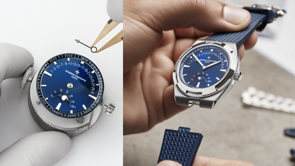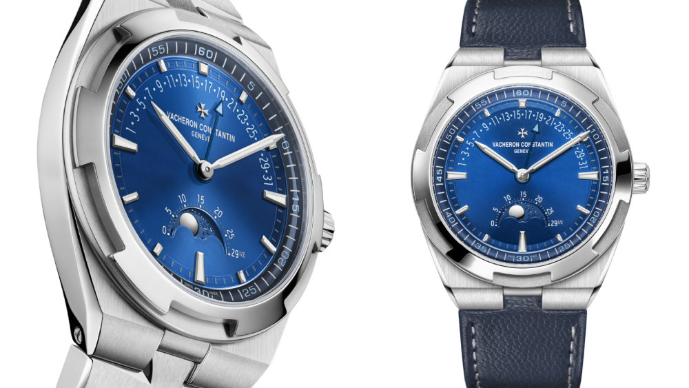 On the more contemporary front, the Overseas Moon Phase Retrograde Date may in fact be the first time a sports watch is outfitted with a retrograde indicator. In a familiar, robust 41mm guise of steel case and bracelet, it is introduced with the Overseas’ famously captivating dial of translucent blue lacquer over a sunburst-brushed base. One of the subtle adjustments that this model has made is that the minute track, usually printed in white, is instead in grey. This helps the retrograde markers and hands, which are in a light blue, stand out better.