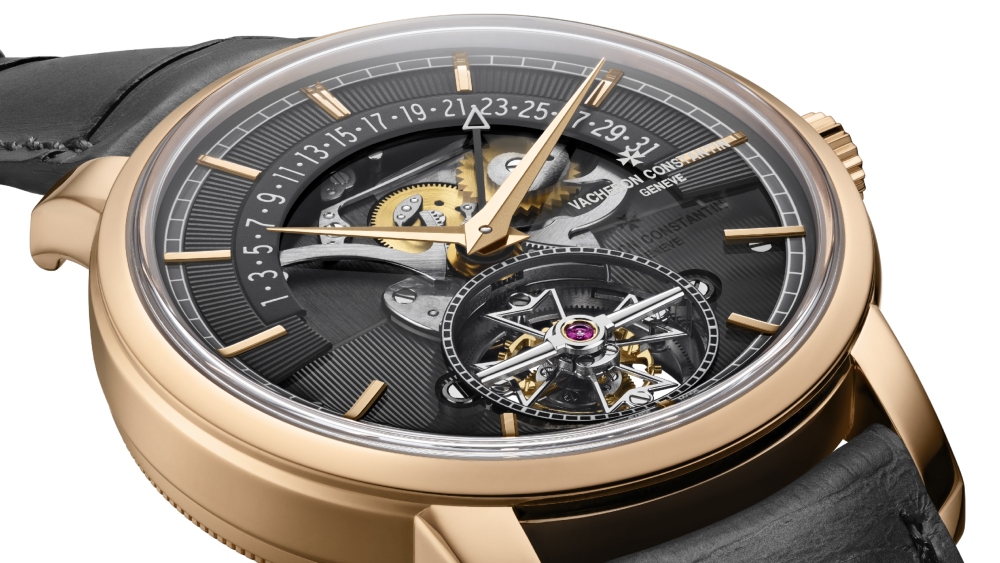 Straddling the line of vintage and modern is the Traditionelle Tourbillon Retrograde Day-Date Openface. Traditionelle is a collection that also leans classical, and thoughmuch of it remains true to its roots, the dark grey dial with transparent sapphire window exposing the grey-finished movement within has one foot firmly planted in more modern territory. It is a look that debuted in 2019 with the Twin Beat Perpetual Calendar and has since been seen on the Complete Calendar Openface, and appears to becoming a Traditionelle signature. Presented in a 41mm pink gold case, the self-winding movement has a peripheral rotor so as not to obstruct viewing through the caseback, and has had the tourbillon carriage raised slightly to bring it level with the retrograde date indicator.