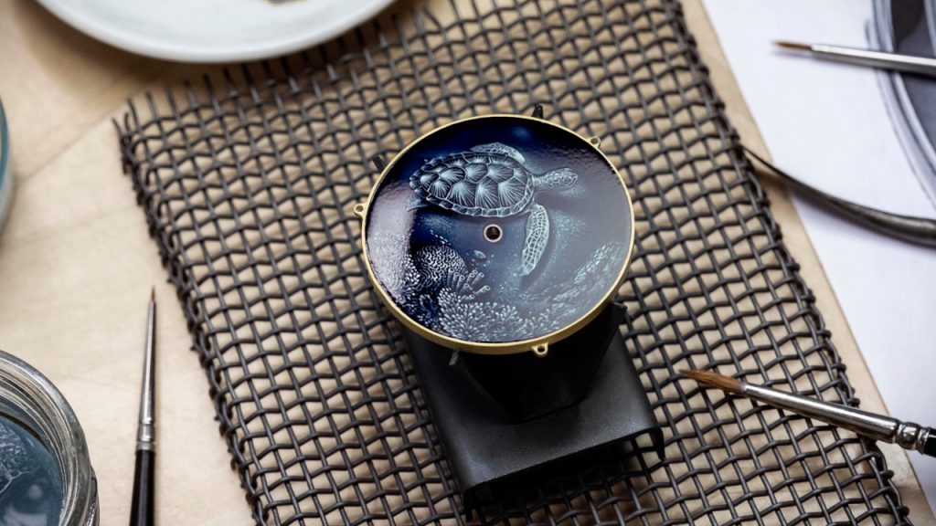 The watch features a classically proportioned 40mm case in white gold with an equally classical three-hand layout. The dial holds no numerals or markers, and is instead devoted to its art. The scene is a simple one – that of a turtle laying on the ocean floor, surrounded by coral – but the depth to the details and rich, contrasting hues are eye-catching on their own.