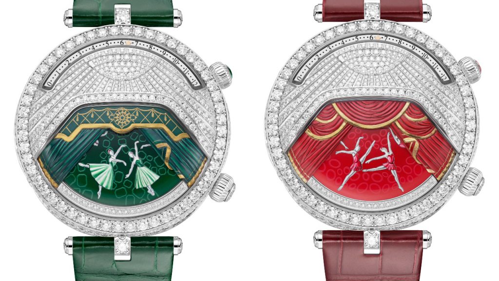 While the music plays, ballerinas painted in various dance poses float by on a disk that rotates through an aperture slightly bigger than that of a typical moon phase display. Here, the opening is meant to represent a stage, surrounded by sculpted, engraved and hand-painted curtains. Both the drapes and the ballerinas are coloured green on the piece representing emeralds, red for ruby and light blue on the diamond piece. The diamond pavé on the upper dial represents a chandelier lavishly cascading over the stage. Diamonds in the case’s side are also arranged so that they fall like folds of fabric over the crowns. The one positioned at 2 o’clock is topped off with a gemstone in accordance with each theme—emerald, ruby or diamond.Despite a dial packed with detailed artistic flourishes, the watch tells time discreetly at the top of the dial using a star that moves across a retrograde hours scale in an arc between 10 o’clock and 2 o’clock, with dots representing 20-minute intervals between each hour. It has a 54-hour power reserve and is manually wound.