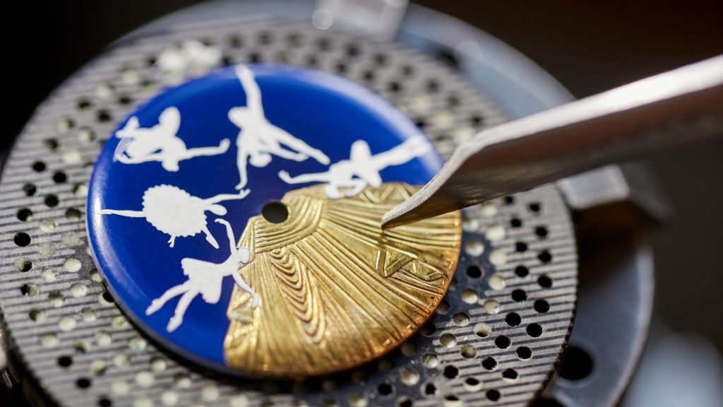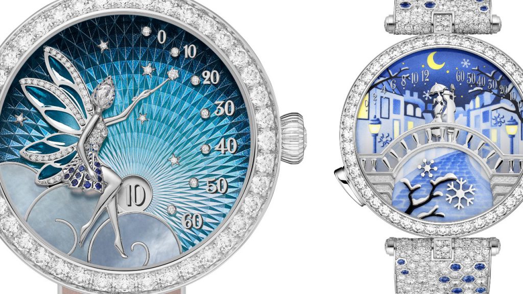 Such animation is also the focal point of the Ballerines Musicales watches, with a musical addition. Upon activation, the sculpted theatre drapes of this collection make way to a rotating scene of ballerinas, set to melody thanks to the mechanism’s integration of a carillon and music box. Dancers a frequent motif for Van Cleef & Arpels, and so are faeries and butterflies. It was the delicate, 33mm in diameter Lady Feerie that won the Ladies’ Complication watch prize at GPHG 2021, which consists of a fairy pointing out the time as she sits on a cloud.
