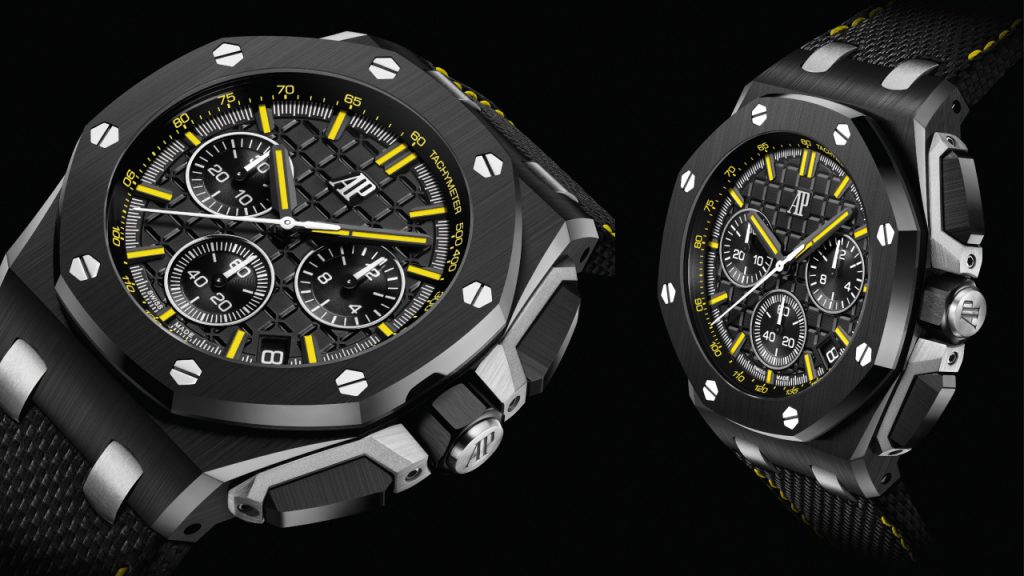 This particular watch is the inspiration behind the new Royal Oak Offshore release that commemorates its 30th anniversary. Like the original, it is a three-register chronograph in black ceramic and bold yellow lume that provides a striking contrast. The 43mm timepiece is very much a modern Royal Oak Offshore, however, in styling (for example, the dial is textured in the modern, bold ‘mega tapisserie’ pattern) and features such as the quick-change textile-patterned black calfskin strap with contrast stitching (an additional yellow strap is supplied for those in a more colourful mood). It holds Calibre 4401, the manufacture’s latest-generation self-winding integrated chronograph movement with flyback function. The Royal Oak Offshore ‘End of Days’ is limited to 500 pieces.