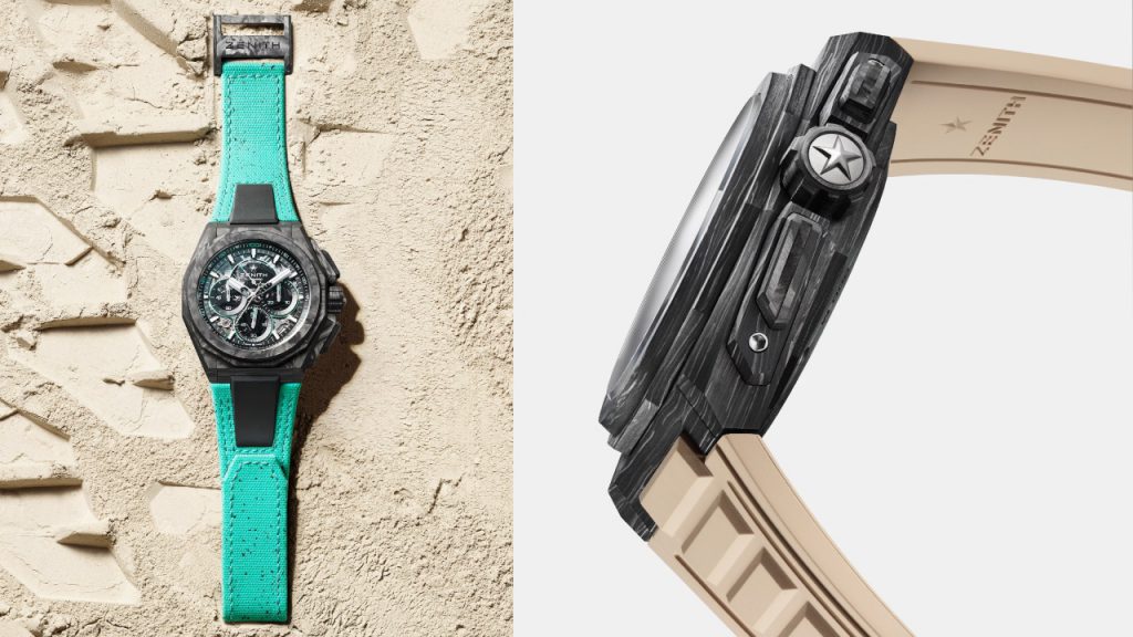 The inspiration comes from observing the vehicles from the 2022 season, which closed out with the Extreme E championship finale in Punta del Este, Uruguay. Zenith noted that the cars were entirely comprised of carbon fibre and wanted to create a watch to reflect that. The result is even more lightweight than last year’s combination of titanium with carbon fiber accents, weighing only 96 grams.