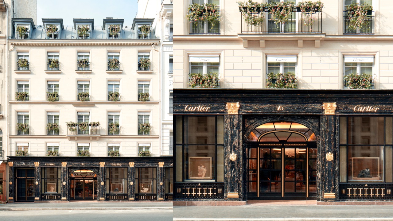 Almost everything was redesigned from the interiors of Cartier’s iconic 13 rue de la Paix boutique, but the black marble on its façade has been preserved.