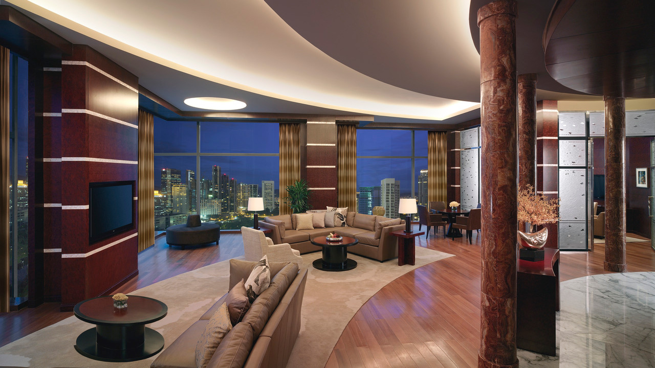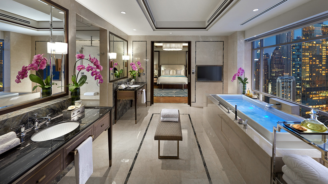 Four Seasons Kuala Lumpur’s Presidential Suite (RM25,000+ per night) provides a snug downtown getaway for a family of two adults and one child across a 182-square-metres on the 18th floor. Living quarters feature a contemporary and clean design with a view of KLCC park, the fountain and the Twin Towers. A full marble bathroom provides an area to refresh for journeying around town, while optional babysitting services are also available should you like to have a romantic dinner in or out of the hotel.