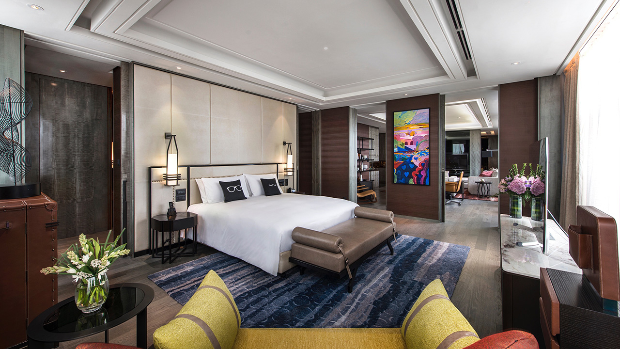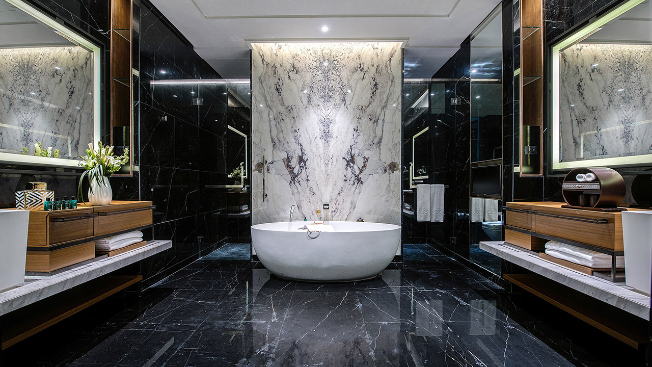 Situated on the two highest floors of the 52-storey EQ hotel is the 235-square-metre Presidential Suite (RM28,000 per night), boasting a dedicated private lift, an open floor concept with floor to ceiling windows, and a team of butlers at your disposal. Across this opulent space are optional four adjoining bedrooms, with the option to convert either to a private spa suite or office, a spacious living area, an upper balcony library, and a black marble-tiled bathroom equipped with an oversized bathtub mounted next to a window with a full view of the iconic KL Tower.