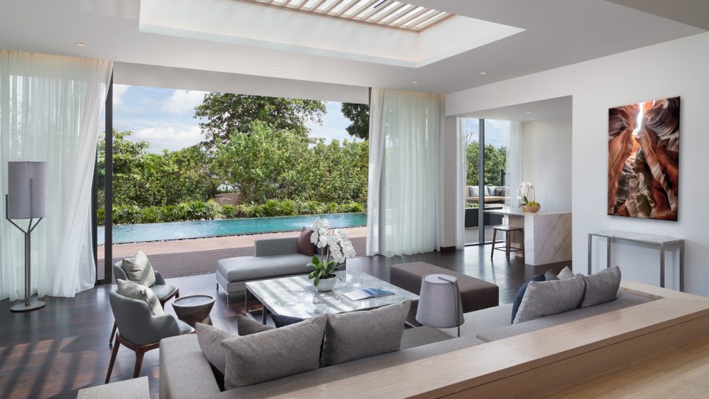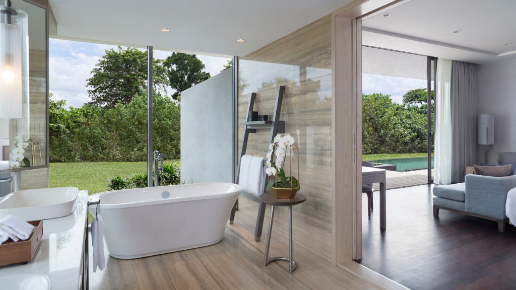 At a built-up size of 288 sqm, a three-bedroom Residence can easily accommodate nine people, all of whom can settle straight in once they’ve acquainted themselves with the generously proportioned living room, dining room, resplendent bathrooms, and wardrobes. A fully equipped kitchen lends a touch of familiar domesticity to the villa, while floor-to-ceiling sliding glass panels encourage sunlight and sea breezes to enter this sophisticated retreat composed of beige stone, polished marble, and soft grey wood.