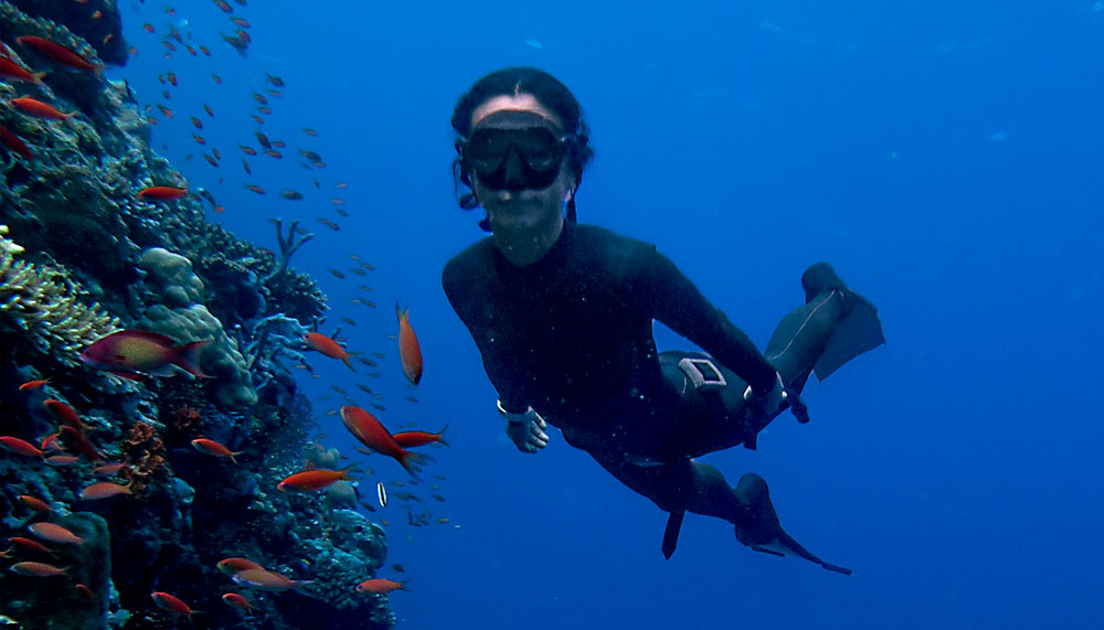 The freediving operation at Anantara opened in May. My instructor was Mari Kagaya, who had taught scuba diving before adding freediving to her repertoire. I expected the lesson to start in the pool or Indian Ocean, but Kagaya began with some history and basic theory. For the next hour we covered freediving-related topics like Boyle’s Law about pressure and gas, the workings of the inner ear, and the connection between breathing and the nervous system. I asked Kagaya why she liked freediving. “I feel more attached to the ocean when freediving. In scuba you discover the place to see, a view, so it’s like travel, like going to a mountain. With freediving, the feeling is more in your mind, inside.”